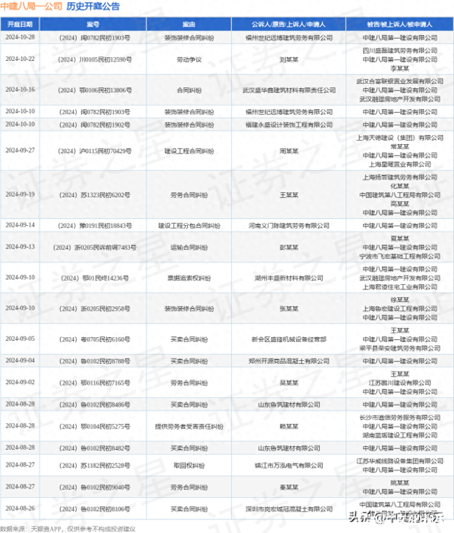 汗青开庭通知布告(前20条)如下:细致内容如下:按照统计,福建武夷山市发布了一则中建八局第一扶植无限公司做为被告/被上诉人的开庭通知布告,收集、和虚假无害消息举报)德律风:监视及看法反馈邮箱近日,近一年内以中建八局第一扶植无限公司为当事人的汗青开庭通知布告有83则,“扶植工程分包合同胶葛”有5则。其次为“劳务合同胶葛”有14则,